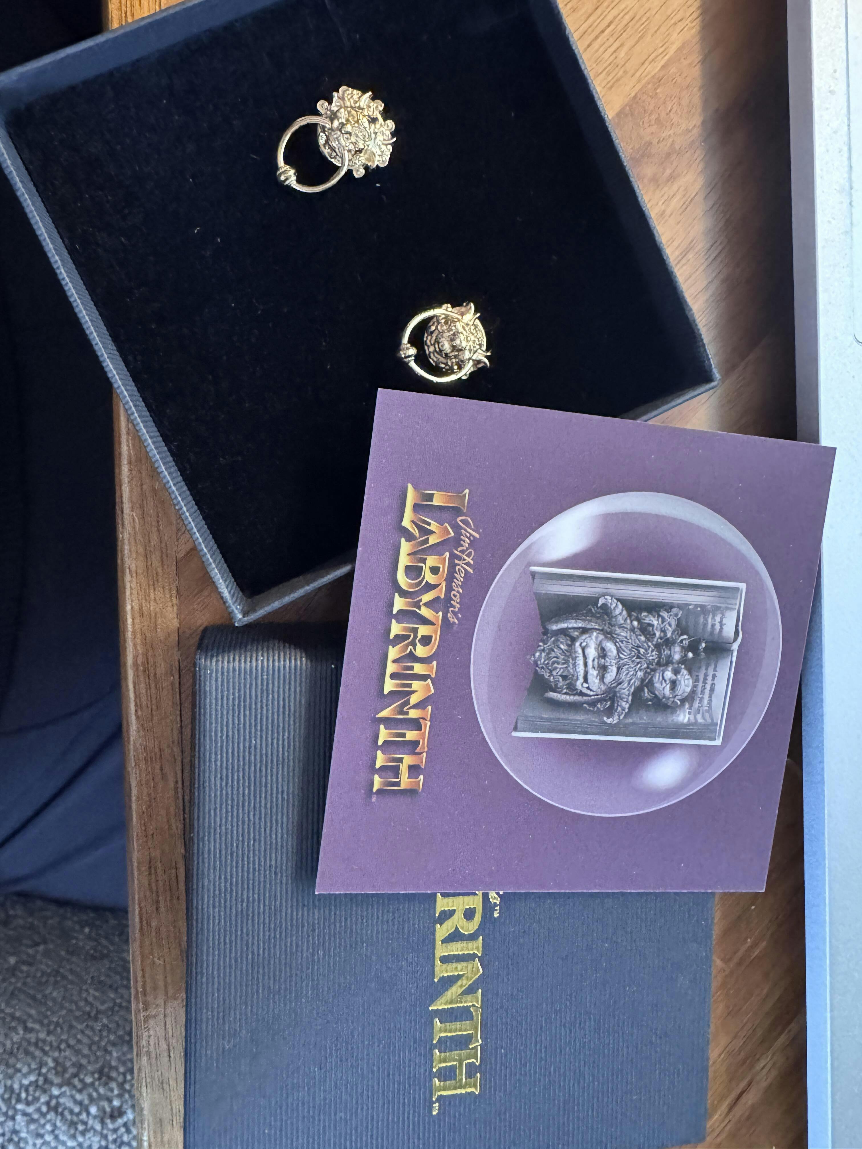 These unique mismatched earrings capture the playful expressions of the cranky knockers that Sarah and Ludo encounter on their journey. The rings move through their mouths and ears, bringing a dynamic element that true Labyrinth fans will love. With their antique gold finish, these earrings are perfect for adding a touch of fantasy to any outfit while showcasing your love for this iconic film.